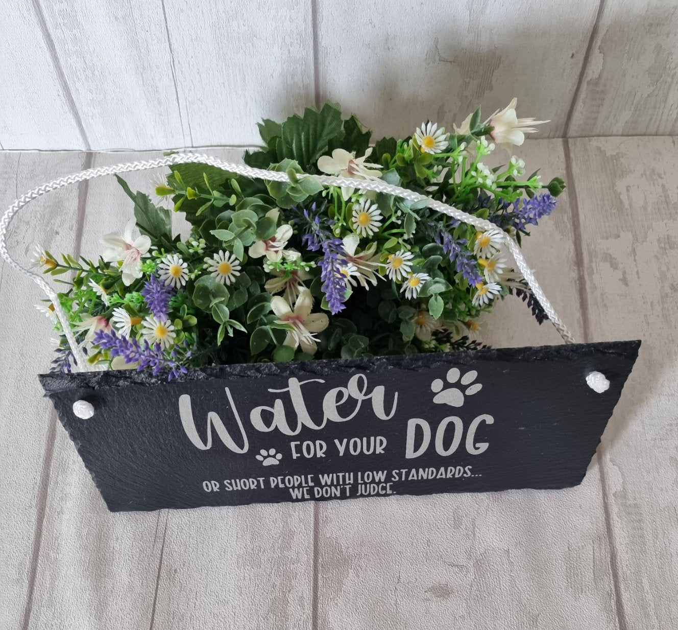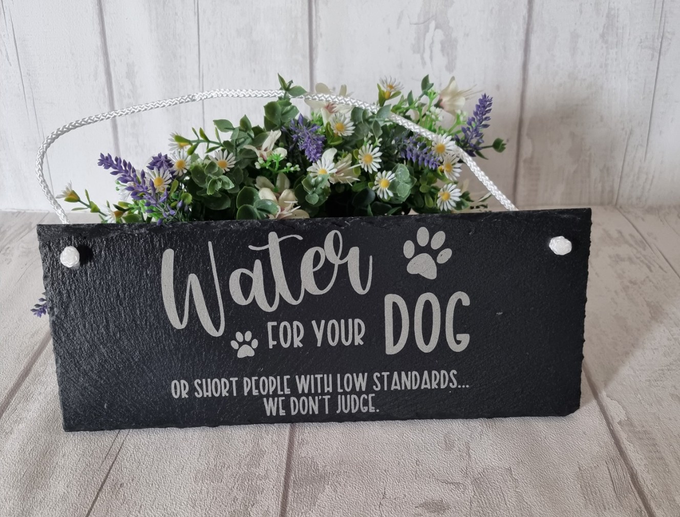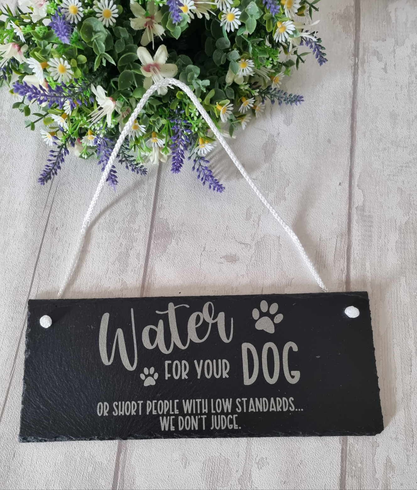 This humorous slate sign is a great way to let people know that your dog could use a drink of water, or that you have low standards, depending on how you look at it.